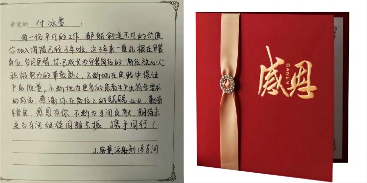 感謝卡:每一份平凡的工作,都能創造不凡的價值,你加入海陵已經3年啦,這3年來一直扎根在包裝崗位,歲月更替,你已成長為包裝崗位的“崗位放心人”。積極努力地帶教新人,不斷地在實踐中保證產品質量,不斷地為更多的患者生產出符合要求的藥品。感謝你在崗位上的兢兢業業,勤奮踏實,感恩有你,不斷為車間貢獻,期待未來與車間繼續同頻共振,攜手同行!