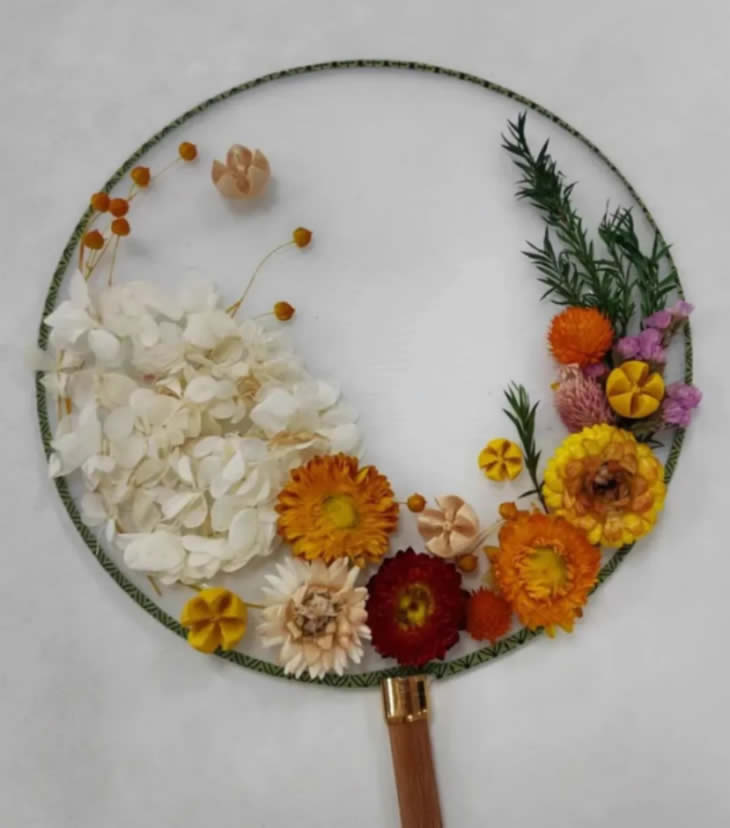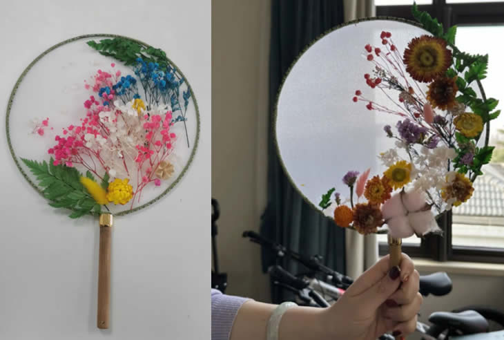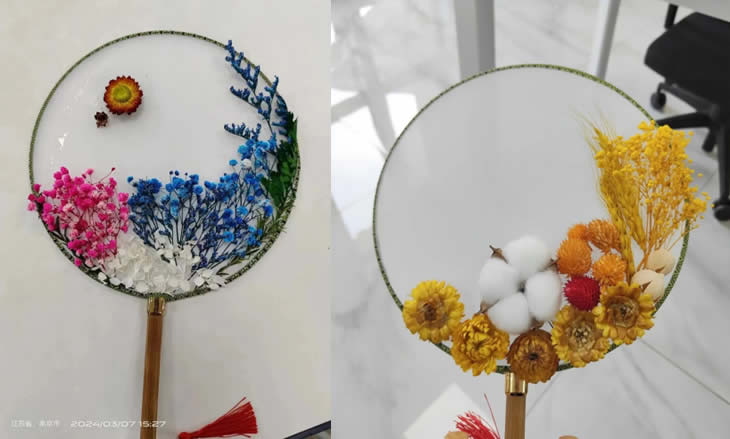 手中白團扇。凈如秋團月。永生花落座于團扇,美在其形,美在其韻,希望“女神”們能與這幅團扇一樣美在其心,美在其魂。
